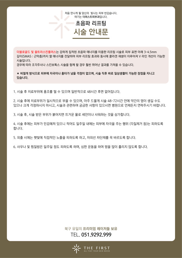 초음파 리프팅 시술 후 주의사항 > 시술 후 주의사항 | 부산 더퍼스트피부과 부산본점 | 화명동 피부과전문의