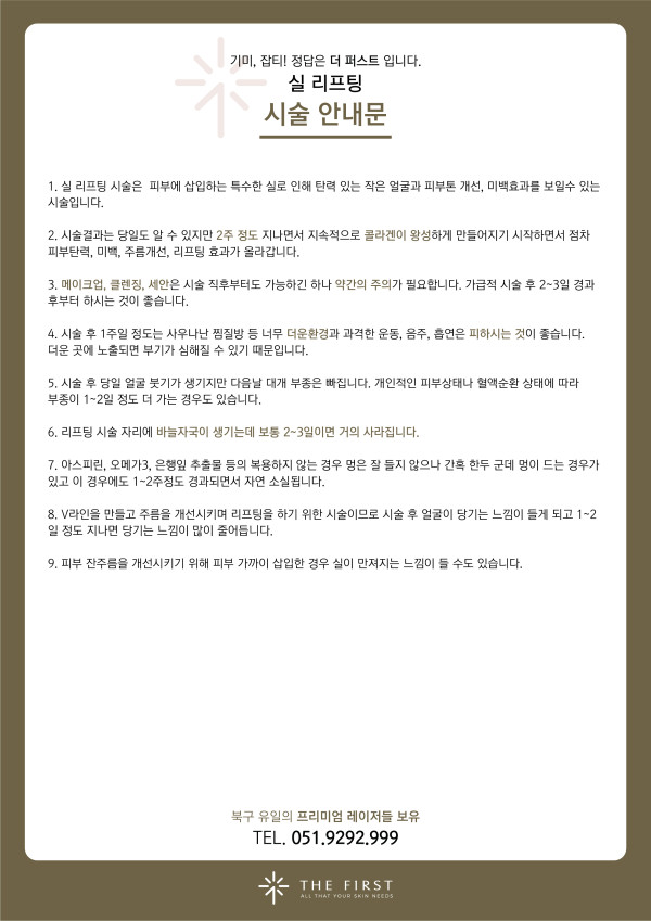 실리프팅 시술 후 주의사항 > 시술 후 주의사항 | 부산 더퍼스트피부과 부산본점 | 화명동 피부과전문의