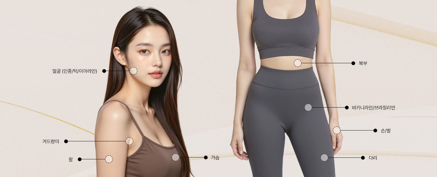 인중, 겨드랑이, 팔, 다리, 비키니 라인, 헤어라인 등 원하는 거의 모든 부위에 시술이 가능합니다.